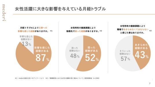 さらに、mederi会員を対象に行ったアンケートでは、87%以上の方が月経トラブルで仕事に影響を感じたことがあると回答。また、勤務先で困った経験があると答えた方は半数以上にのぼり、女性活躍推進の陰で多くの女性が生理関連の悩みを抱えていることが明らかになりました。