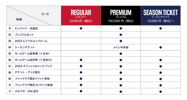 今シーズンのファンクラブは「レギュラーコース」、「プレミアムコース」、「シーズンチケットコース」の3つのコースをご用意。