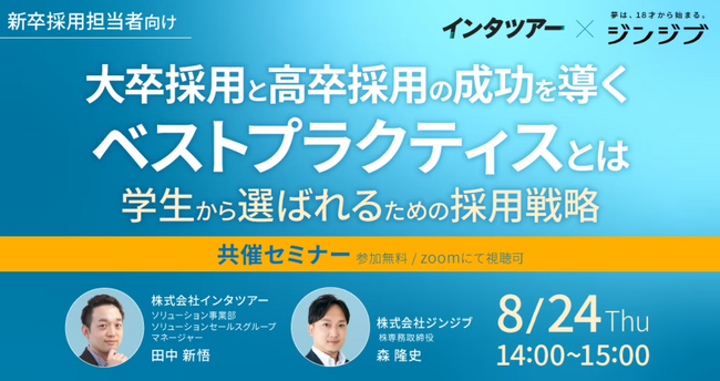 働くに関する社会課題をビジネスで解決するキャムコムグループの株式会社インタツアー(本社:東京都港区浜松町、代表取締役:作馬 誠大、以下インタツアー)と高卒採用市場のパイオニアである高卒採用支援サービス「ジョブドラフト」を提供する株式会社ジンジブは、2023年8月24日(木)14:00 から、大卒・高卒採用担当者向けオンラインセミナー『大卒採用と高卒採用の成功を導くベストプラクティスとは 学生から選ばれるための採用戦略』を開催いたします。