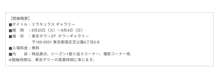 この度、8月23日(火)より東京タワー 3階タワーギャラリーにて「ミラキュラス ギャラリー」の開催が決定しました!ミラキュラス初の無料ギャラリーとなり、日本で発売した商品の展示や、シーズン1を振り返るコーナー、一緒に写真が取れるスタンディなどを展示予定です。