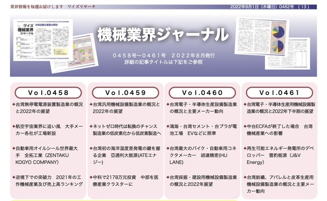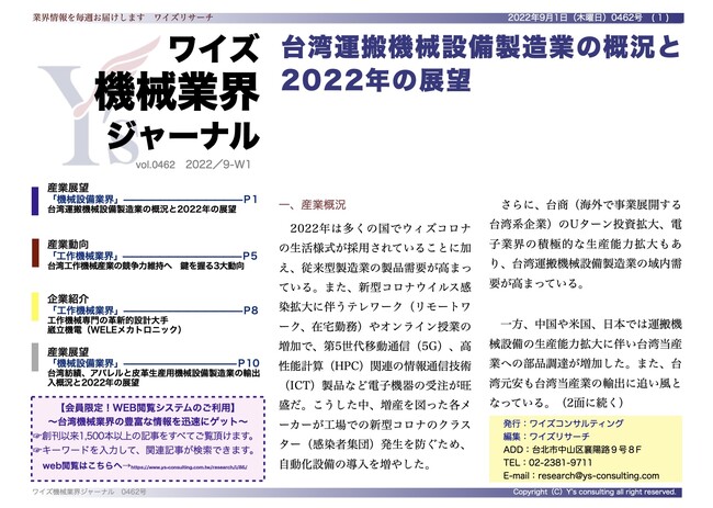 ワイズコンサルティング グループ(本社:中華民国台北市、代表取締役:吉本康志)は台湾機械業界専門誌「ワイズ機械業界ジャーナル」の2022年9月第1週号を発行しました。今週号では、機械設備業界、工作機械業界、工作機械専門の革新的設計大手のWELEメカトロニックと紡績・アパレル業界生産用機械設備の輸出入概況をご紹介します。