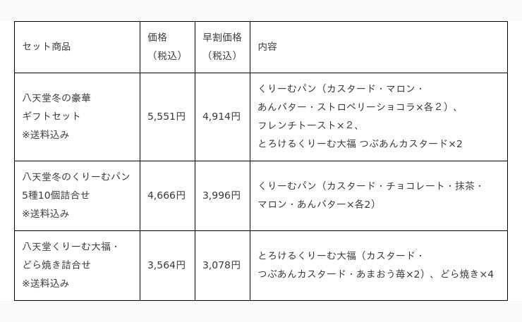 定番のくりーむパンをはじめ、オンラインショップ限定のあったかスイーツ「フレンチトースト」、八天堂ならではの和スイーツ「とろけるくりーむ大福」など、様々な商品をラインナップ。季節限定フレーバーの「マロン」「あんバター」「ストロベリーショコラ」が入ったセットもご用意しています。早めのご注文、お届け日指定無しでお得な価格の早割もございます。