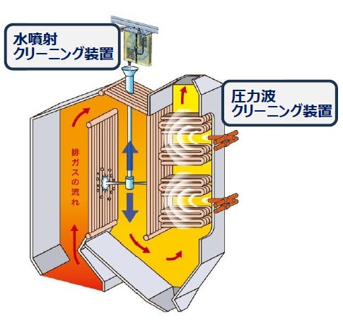 ボイラークリーニング装置として従来は蒸気式スートブロワが主流でしたが、これに代わり、発電用蒸気を使用しないため発電効率を維持でき、ボイラーを摩耗させないため設備の長寿命化にもつながる圧力波クリーニング装置が広く採用されるようになっています。