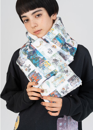『100万回生きたねこ』の12枚のイラストをパッチワークのように並べてパターンにしたデザインとボアを組み合わせたカジュアルなマフラー。中綿入りマフラーの内側に肌触りが良いボアを使用し、首元をしっかりと包み込み、ボリューム感のあるデザインです。スタイリングの差し色やアクセントとしてもおすすめです。