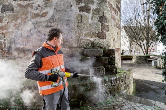 ケルヒャーの独自技術で開発した「温水除草システム(R)」。最高98℃の高温水を継続的に安定供給するボイラー、場所にあわせて均一な高温水を効率よく散布できる除草ノズルなど、様々な技術を活用。(2022年商標登録)