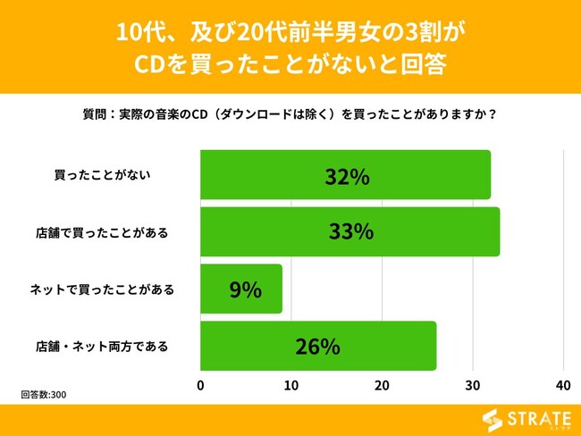 10代~20代前半の男女を対象とした「実際の音楽のCD(ダウンロードは除く)を買ったことがありますか?」というアンケートで最も多かった回答は「店舗で買ったことがある」で33%でした。