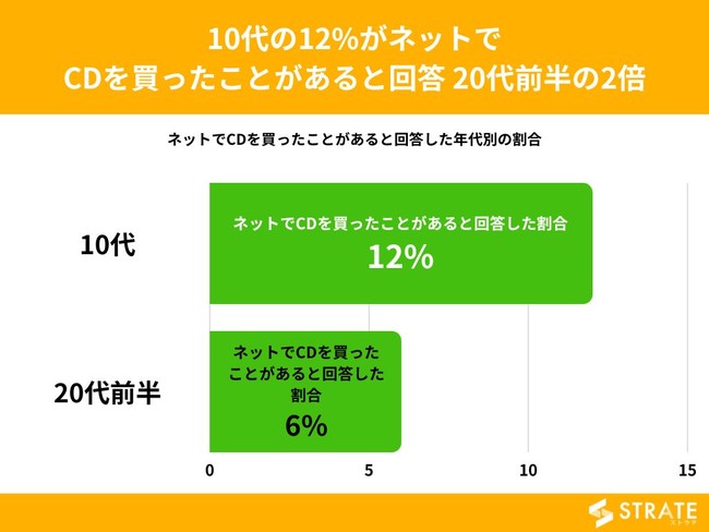 ネットでCDを買ったことがあると回答した割合を年代別でみてみますと、10代が12%、20代前半が6%という結果になりました。