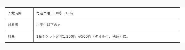 ・小学生以下のお客様は20歳以上の保護者同伴でご利用いただけます。6歳以上の内湯の男女混浴はできません。おむつ着用の方の水着ゾーンのご利用はご遠慮ください。