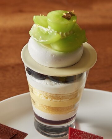 人気品種の二大ぶどうシャインマスカットと巨峰を同時に味わえる贅沢なスイーツです。メレンゲの中にはマスカットのコンフィチュールに果実の甘みを引き立てるホワイトチョコクリームを忍ばせ、コク深い味わいと後に引く爽やかなマスカットの風味をお愉しみ下さい。グラスの中では皮ごと頂ける巨峰と巨峰のジュレを重ね、最後の一口までぶどうの甘味に浸れる一品です。