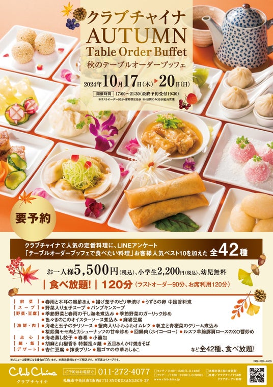 株式会社あいプラン(北海道札幌市)の札幌市のレストラン クラブチャイナでは、2024年10月17日(木)~20日(日)の4日間限定でテーブルオーダーブッフェを開催。小籠包や五目あんかけ焼きそば、海老蒸し餃子などお客様からの投票で決まった人気10種や秋のメニューなど全42種類が食べ放題。