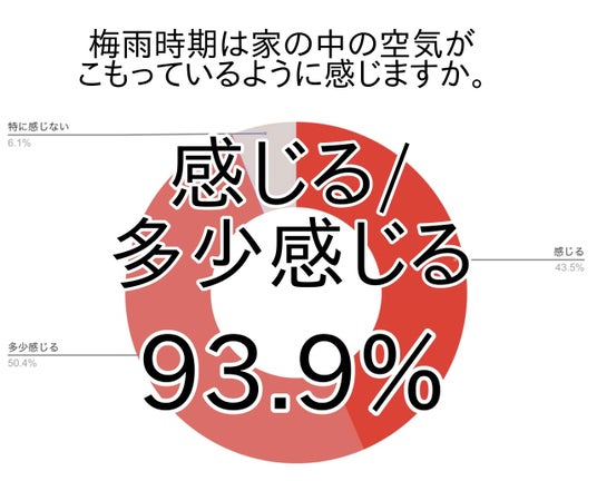 アンケートでは、梅雨時期は家の中の空気がこもっているように感じる/多少感じると答えた方は約9割(関東93.9%・全国90.5%)でした。