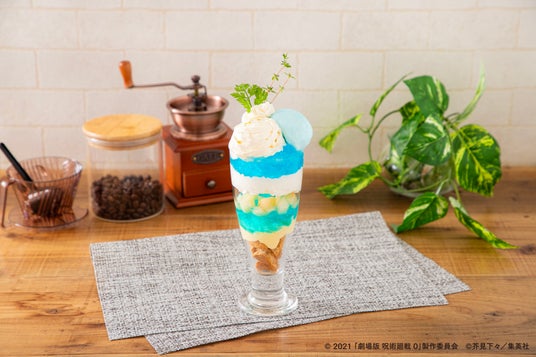 ラムネシャーベットやクリームチーズアイスなどで五条のキャラカラーをイメージしたパフェ。