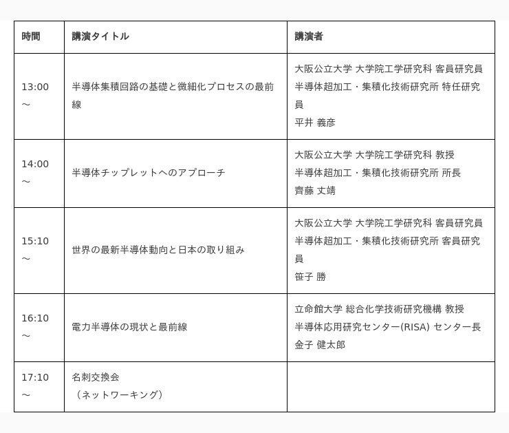 サテライト講演会では、堺市および近隣の産業界、および大阪公立大学教員・学生を対象に最近の半導体事業をわかりやすく解説します。半導体業界での中小企業の活躍についても言及いただく予定です。またプログラムの最後に名刺交換会(ネットワーキング)を開催します。皆様のご参加をお待ちしています。