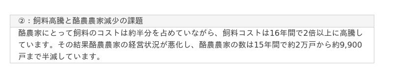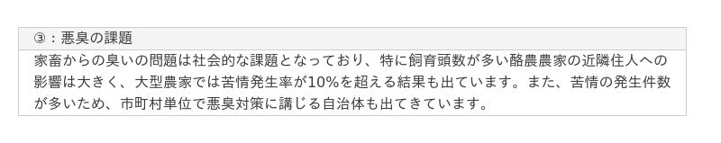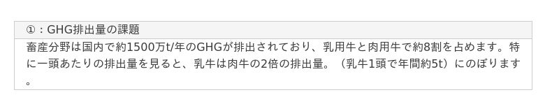 酪農分野には、1.GHG排出量の課題、2.飼料高騰と酪農農家減少の課題、3.悪臭の課題が挙げられます。