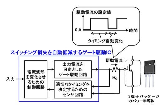 パワー半導体の負荷電流や温度などの動作条件が変化しても、ゲート駆動電流のタイミングを自動調整し、スイッチング損失を常に低減。