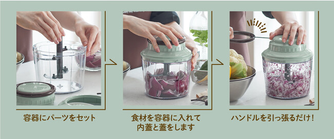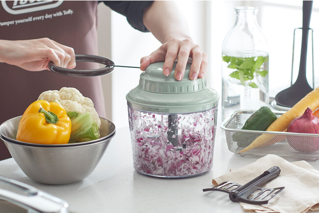 Toffyのハンディチョッパーシリーズは、ハンドルを引くだけで食材を細かく刻むことができる時短調理器具です。面倒なみじん切りを力要らずでスピーディーにこなします。電源不要で、使う場所も選ばない便利なハンディチョッパーは、累計販売台数約70万台の大人気シリーズです。