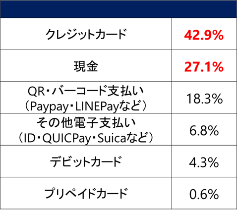 最もよく利用する決済手段として挙げられたのはクレジットカード(42.9%)、次いで現金(27.1%)。