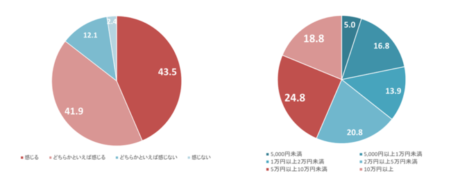 日常生活の中で現金が無いと不安を感じるかという質問については、職業別にみると、専業主婦・主夫が最も高く、85.4%が「感じる」「どちらかといえば感じる」と回答し、平均を12.9%上回っている結果。