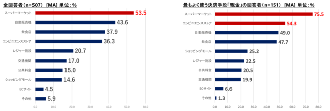 さらに最もよく使う決済手段別に見てみると、現金を最もよく使うユーザーの場合、75.5%が「スーパーマーケット」、54.3%が「コンビニエンスストア」で現金を利用すると回答し、日常利用のシーンで現金への依存率が非常に高いことが伺えます。