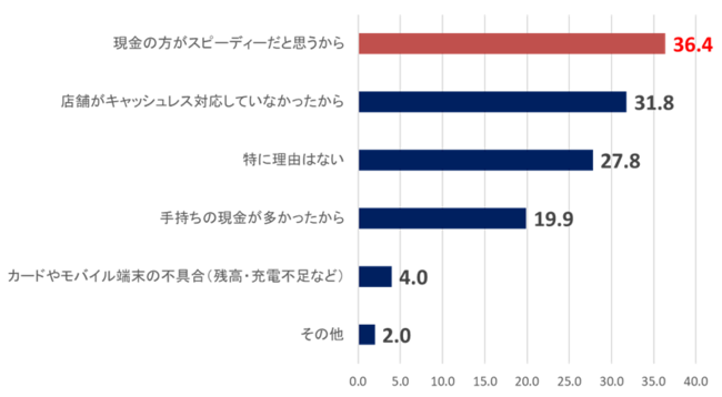 キャッシュレス決済と現金を併用していると回答した507名へ、生活の中で現金を使うシーンはどんな時かを問う質問では、最も多かったのは「スーパーマーケット」(53.5%)となりました。そして、その理由として挙げられたものの中で最も多かったのは「スピーディーだから」(36.4%)でした。