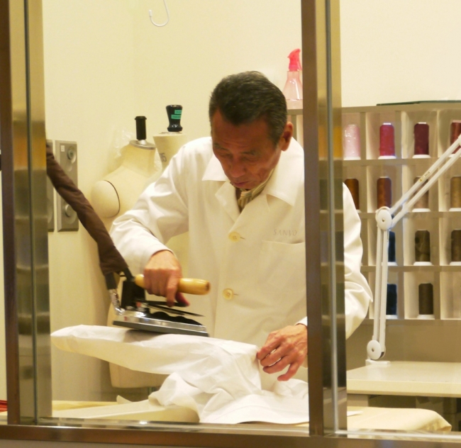 内 容 :三陽商会のプレス技術者 樋代 廣人が、家庭でもできるアイロン技術の極意を紹介。後半は店内に用意したアイロンを用いてレクチャーの内容をお客さまにも実践いただく時間を設けています。参加されたお客様には、メード・イン・ジャパンを基本としたブランド「SANYO ESSENTIALS」オリジナルのリネンウォーターをお土産としてご用意しています。