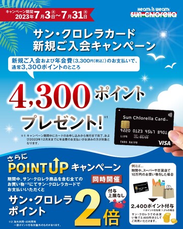 ライフカード株式会社(代表取締役社長:増井啓司)とサン・クロレラジャパン株式会社(代表取締役社長:中山太)は、提携クレジットカードSun Chlorella Card(サン・クロレラカード)のポイント2倍キャンペーンを2023年7月3日(月)より実施いたします。