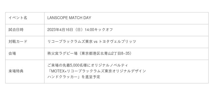 エムオーテックス株式会社(本社:大阪市淀川区、代表取締役社長:宮崎 吉朗、以下MOTEX)は、株式会社リコー(本社:東京都大田区、代表取締役 社長執行役員:山下 良則、以下リコー)保有のラグビーチーム「リコーブラックラムズ東京」のホストゲーム[日程:2023年4月16日(日)/会場:東京・秩父宮ラグビー場]に冠協賛し、「LANSCOPE MATCH DAY」として開催することを発表します。