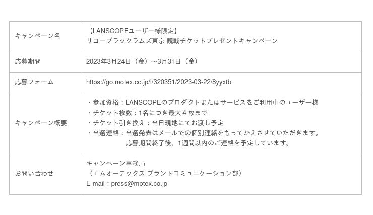 皆さまの日頃のご愛顧に感謝し、LANSCOPEのプロダクトまたはサービスをご利用中のユーザー様を対象に、下記フォームよりご応募いただいた方の中から抽選で100様に観戦チケットをプレゼントします。