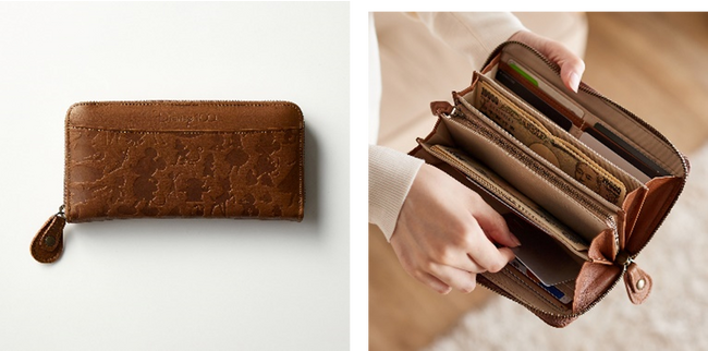 第3弾で販売するのは、ディズニーピクサーのキャラクターたちのシルエットを贅沢に型押しした、「本革型押し長財布(Disney100)」と「栃木レザー製の伸縮リール付きパスケース(Disney100)」の2点です。どちらもディズニー、ピクサーの様々なキャラクターが一堂に会するデザインに特別感があり、また本革を使用した日本製の商品です。使うごとに革の色つやが深まり、味わいも愛着も増す長く使用いただけるアイテムです。