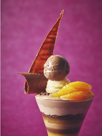 フィニッシュにゲストの前で削るカルダモンのスパイスが、ネクストステージのショコラパフェへ。フルーツとしてのチョコレートをコンポートオレンジが引き立てます。