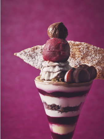 ふんだんに栗をつかった、秋の味覚を味わえる贅沢なパフェ。カシスブルーベリーの酸味とラム酒の華やかなフレーバーでグラマラスなテイストに仕上げました。