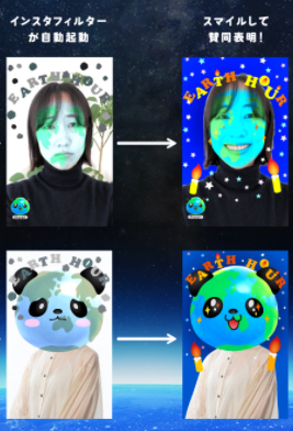 InstagramのARフィルターは、地球とパンダに変身できる2種類を公開中。表情と連動して、笑顔になると地球とパンダに変化が・・・? 地球規模の環境問題を「自分事」として考える、 EARTH HOURをそのキッカケにするために、地球の気持ちになれるフィルターを作りました。