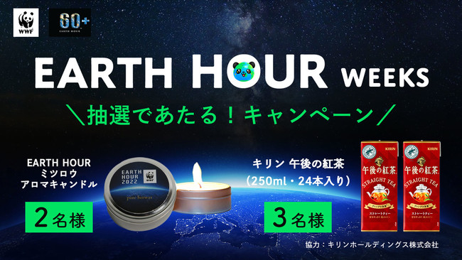プレゼントの応募方法はTwitterとInstagramの2通り。プレゼント商品として、WWFジャパンの公式通販「PANDA SHOP」からは、消灯時間を過ごすのに役立つオリジナルグッズ「EARTH HOUR・ミツロウアロマキャンドル」[KJ6] を2名に、EARTH HOUR 2022 協賛企業のキリンホールディングス株式会社ご提供による、 レインフォレスト・アライアンス認証茶葉を利用し、FSC(R)認証紙を製品パッケージに使用した『キリン 午後の紅茶』(250ml・24本入り)1ケースを3名に、合計5名の方に差し上げます。(FSC(R)️N002174