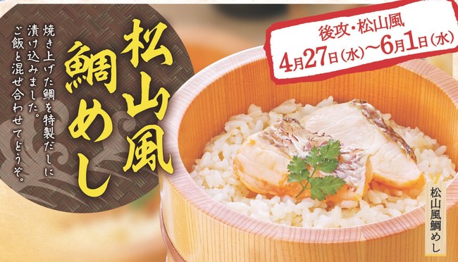 そして後攻(4月27日~6月1日)は、香ばしく焼き上げ特製出しに漬け込んだ真鯛を、ごはんと混ぜ合わせて楽しむ「松山風鯛めし」で、最後の〆は出し茶漬けとしても楽しめる一品です。