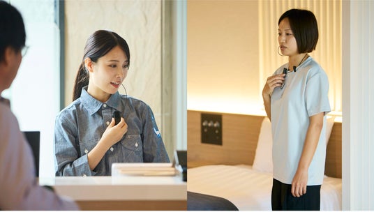 出展エリアでは、新商品「BONX Stick」のデモ機も展示します。BONX StickはスマートフォンとBluetooth(R)接続された本製品を胸元に装着し、有線タイプのイヤフォンを本体に差し込んで使用する形になっています。これにより、耳への負荷の軽減、バッテリーの増強、共有端末としての利便性の向上を実現しました。本製品には周囲の音をカットして話者の声だけを届けるNTTの特許技術を搭載。建設現場などの騒音下やBGMの大きい店内などにおいて快適なコミュニケーションが可能となります。