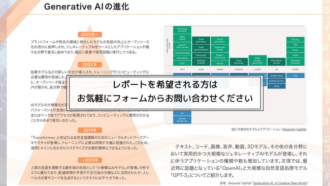本レポートは、前半部分ではGenerative AIの進化の歴史や、近年特に話題となっている「OpenAI」と大規模な自然言語処理モデル「GPT-3」、そして「ChatGPT」の解説を行います。後半ではジェネレーティブAIの分野でモデルやアプリケーションを展開する有望なスタートアップをカテゴリー別に紹介します。