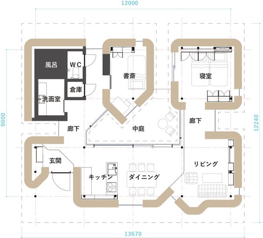 室内にはLDK、トイレ、バス、居室のほか、中庭などを設け、自然光や風を効果的に取り入れる設計を採用。環境と調和し、季節を感じながら快適に暮らせる生活空間を提案しています。