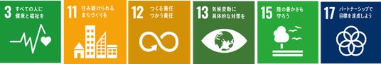 当社は、本事業の開発を通じて、SDGs番号3「すべての人に健康と福祉を」、SDGs番号11「住み続けられるまちづくりを」、SDGs番号12「つくる責任つかう責任」、SDGs番号13「気候変動に具体的な対策を」、SDGs番号15「陸の豊かさも守ろう」及びSDGs番号17「パートナーシップで目標を達成しよう」の実現に努めてまいります。