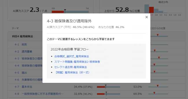 「AI実力スコア」では、全体スコア、科目別スコア*1、テーマ別スコア*2について、全受講者中(過去1年間以内に学習した受講者中)の「あなたの位置」を表示します。これにより、他者と比較したときの、自分の強み・弱みがわかるため、さらに効率的な学習が可能になります。