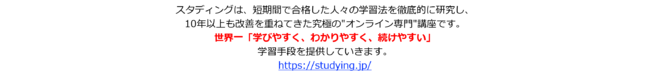 「スタディング」(https://studying.jp/)は、短期間で合格した人々の学習法を徹底的に研究し、10年以上も改善を重ねてきた究極のオンライン資格取得講座です。
