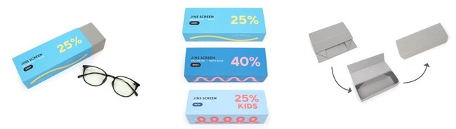 新しいJINS SCREENは、雑貨のようなカラフルで楽しいスリーブを、グレーの紙製ケースに装着した状態で販売。商品が入ったケースは十分な耐久性があるよう設計し、そのままメガネケースとして活用可能。使用しないときはコンパクトに折り畳むこともできます。無駄が少なくサステナブルかつ便利な仕様へと進化しました。