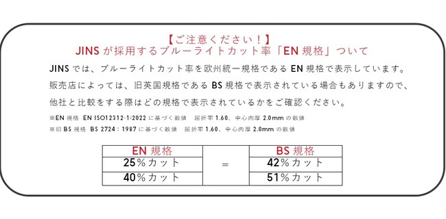 JINSでは、ブルーライトカット率をこれまで同様、欧州統一規格である「EN規格」で計測。レンズが透明に近く、いつでもかけられる自然な見た目の25%カットレンズと、長時間用の40%カットレンズの2種をご用意しています。