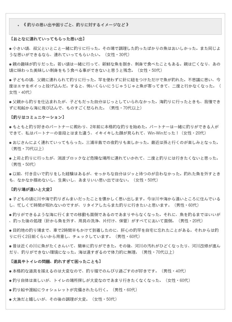 釣りに関する思い出やエピソードを募集しました。「子ども時代に大人に連れていってもらった」「会社の同僚と釣りにいった」という似たような思い出であっても、本人にとって、いい思い出になっていることもあれば、逆にネガティブな記憶になっていることも。釣り糸などのゴミ問題も、釣り人に対するイメージを悪くしているようです。釣り人の一人ひとりが心がけることで、釣りを好きになる人を増やせるのかもしれません。