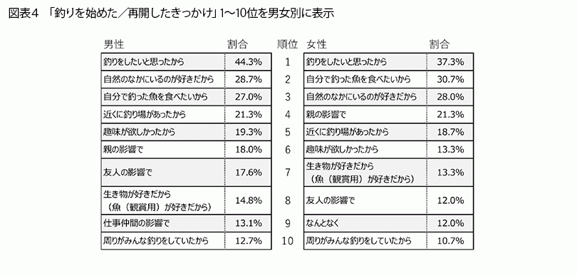 2位と3位は男女で違いがあり、男性の2位は「自然のなかにいるのが好きだから」、女性の2位は「自分で釣った魚を食べたいから」です。上位10項目を男女別に見ると(図表4)、多少の順位の変動はあるものの、似たような並びになっています。