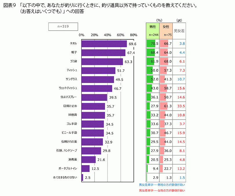 次に、釣り道具以外に釣りに持っていくものを聞きました(図表9)。1位から5位までは「タオル」(69.6%)、帽子(67.4%)、「ゴミ袋」(63.3%)、「ティッシュ」(51.7%)、「サングラス」(49.5%)という順でした。ただ、男性が持っていかないものでも、女性は持っていくことが多いようで、多くの項目で、女性のほうが割合が高くなっています。