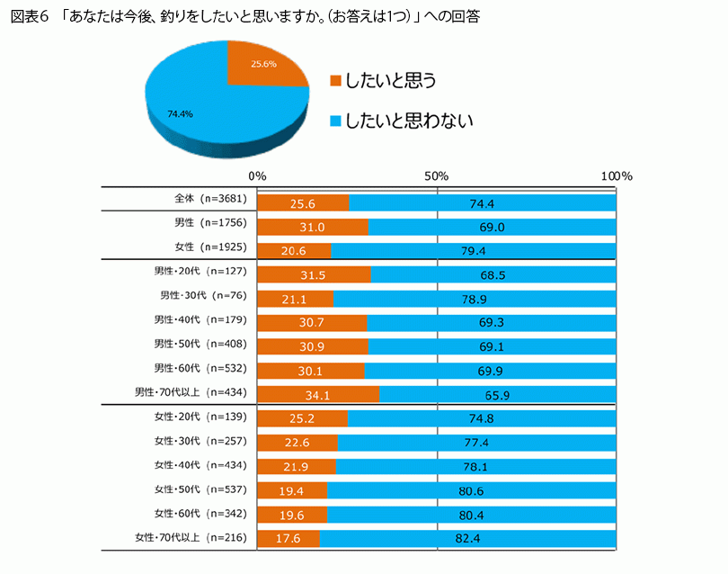 また、現在、釣りをしていない人を対象に、今後釣りをしたいかを聞くと(図表6)、「したいと思う」人は25.6%でした。この質問についても、親の影響は大きく、親が釣りをしていた人だと、「したいと思う」が43.7%、親が釣りをしていない人だと20.8%でした(図表不掲載)。