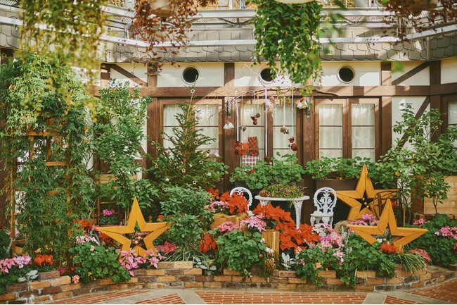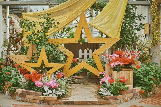 クリスマスガーデン「キラキラクリスマス」:木製の大きな星のオーナメントやゴールドの大きな布、ポインセチア、プリンセチア、シクラメン、ゼラニウム、シルバーリーフなどのクリスマスカラーの植物で、グラスハウスのエントランスを演出。フォトスポットとして賑わいます