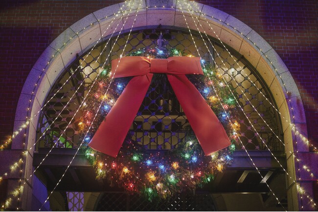 大きなウェルカムリース「ようこそ、ハーブ園へ」:直径約3m。ヒノキの葉(ヒノキ1本分)と赤いリボンの巨大リースでお客様をお迎えします(約500球のライトを使用) 常時点灯