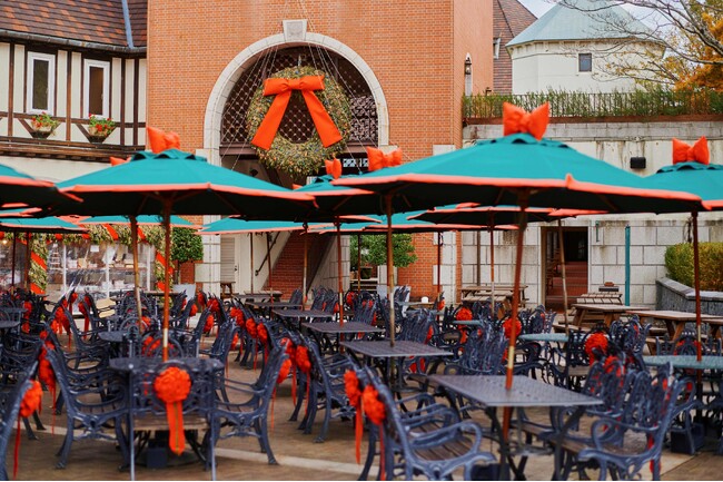展望プラザ「チェアリボン&パラソルリボン」:ずらりと並ぶ赤いチェアリボンとパラソルリボンで、中世ヨーロッパの古城の広場がクリスマスカラーに染まります