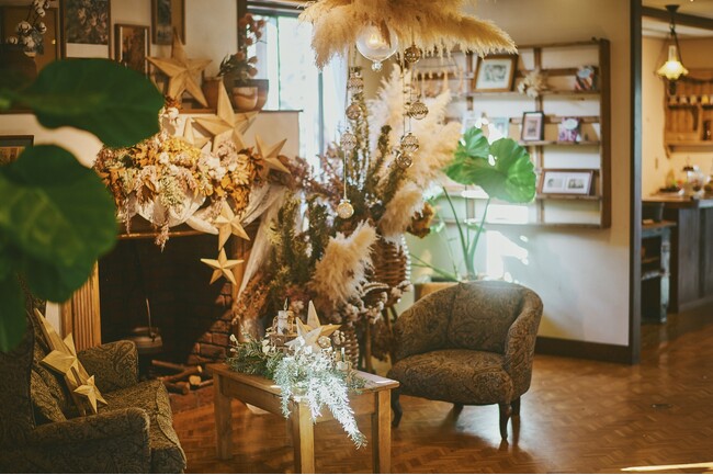 ハーブの家「ナチュラルクリスマス」:フォトスポットとして人気のドライフラワーで彩る暮らしの展示空間。リビングをドイツトウヒやモミノキ、パンパスグラス、コットンフラワーなどの自然素材で彩ります